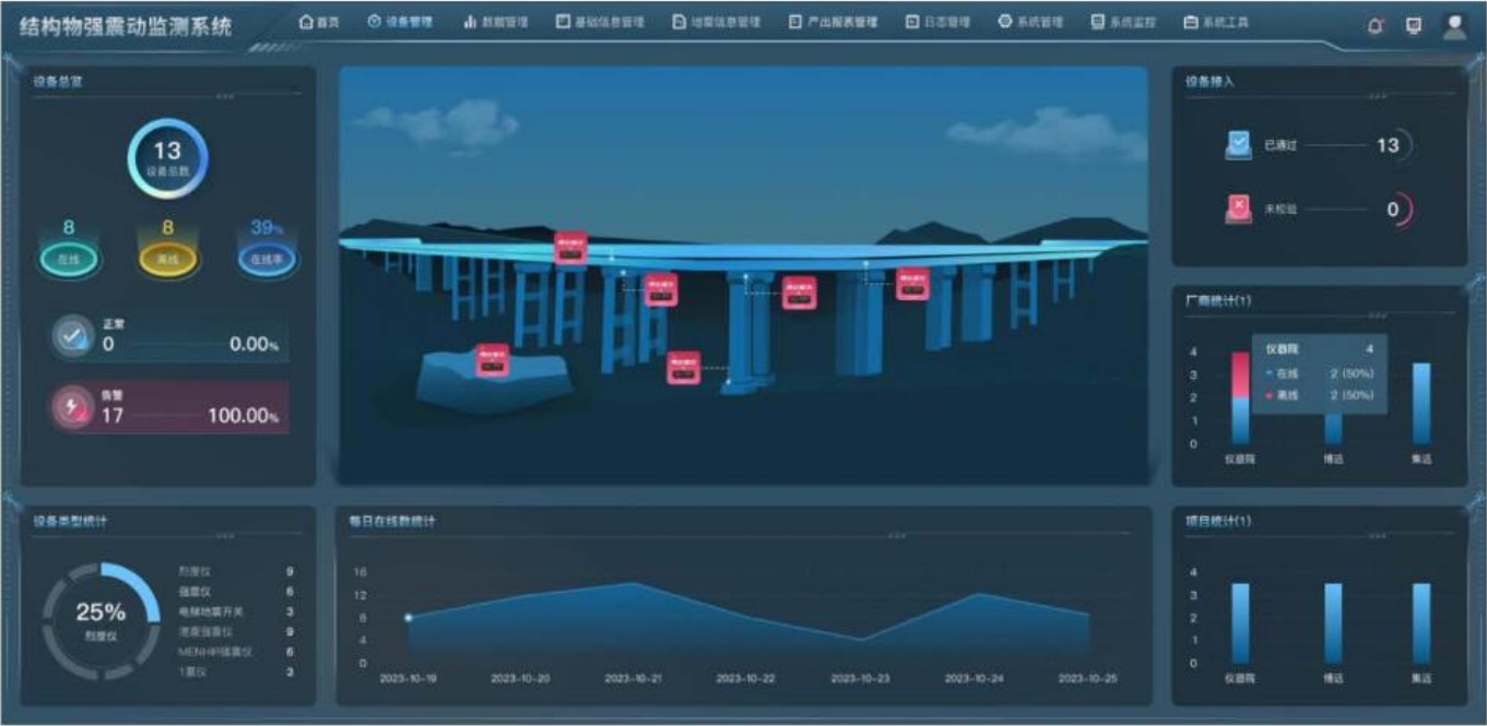 10、展示设备总数量、设备类型统计、设备详情、触发统计、项目统计等功能;在项目主界面中还可以查看桥梁模型图,桥梁模型图中可以查看到测点。