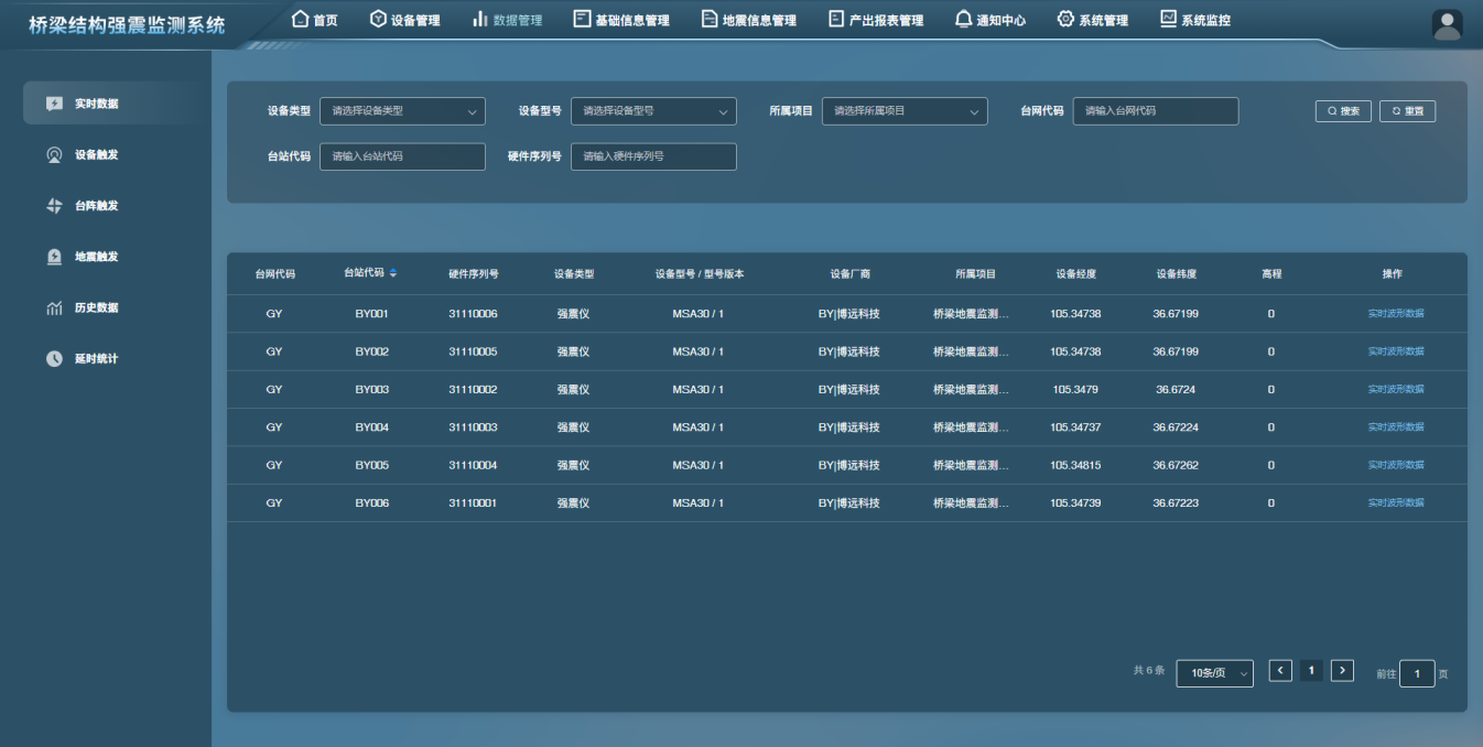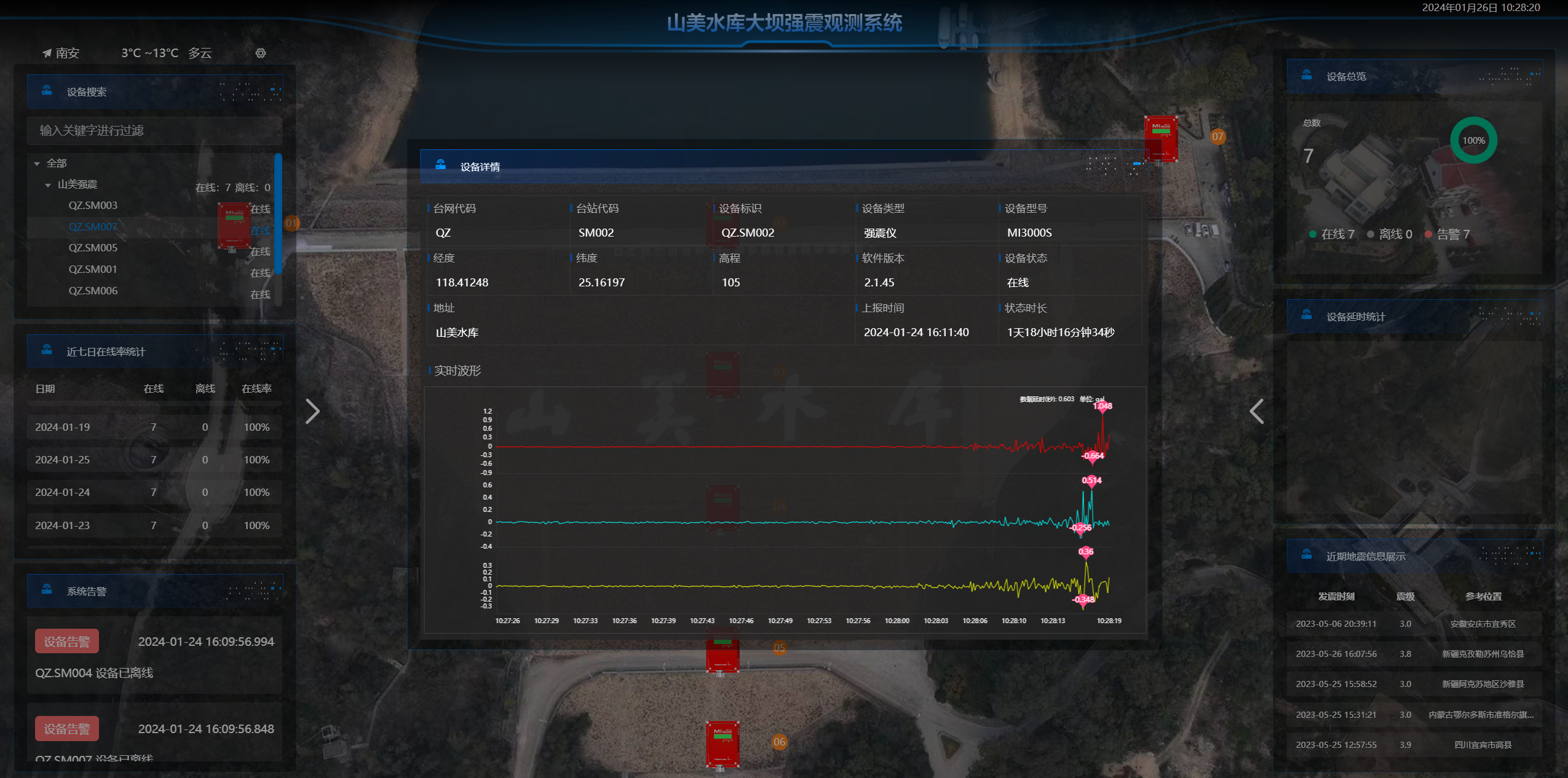 7、全国区域内,有地震发生时,实时计算对项目现场的影响:预估地震烈度,预估到达时间等。并提前通过系统给出预警信息,地震到达前、中、后,数据实时联动记录分析,评估地震实际破坏。