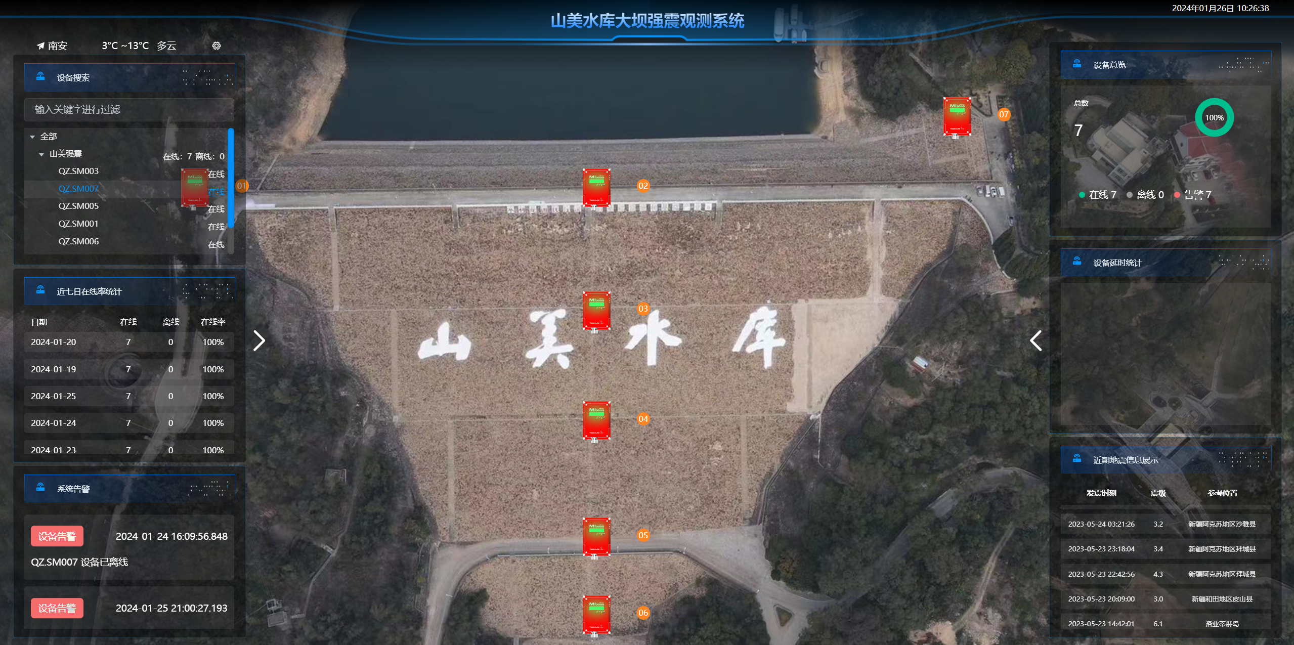 10、展示设备总览、设备类型、在线率统计、设备详情、触发统计、项目统计等功能;在项目主界面中还可以查看大坝模型图,大坝模型图中可以查看到测点。