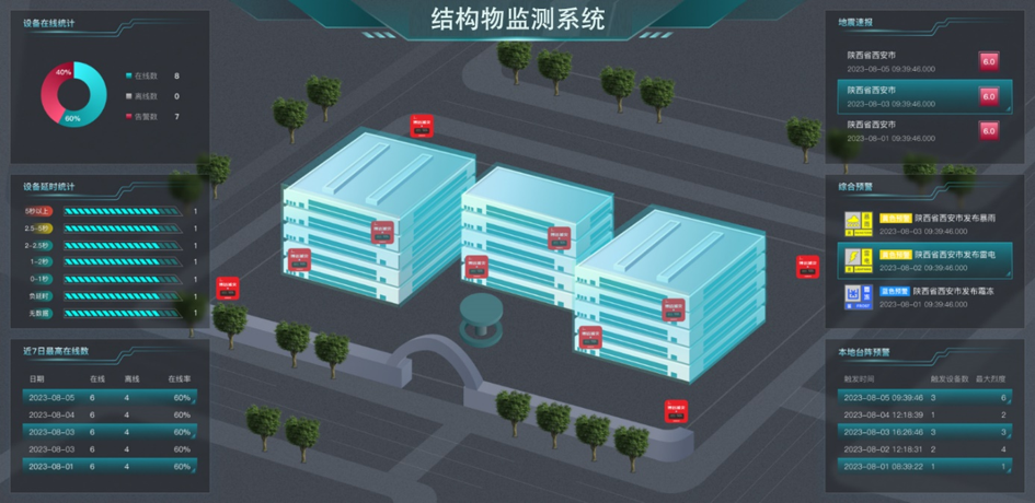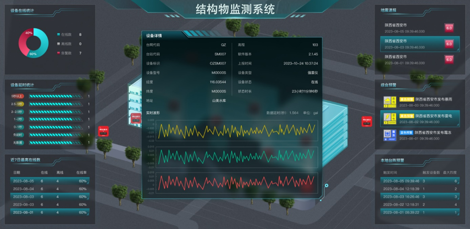 9、展示设备总览、设备类型、在线率统计、设备详情、触发统计、项目统计等功能;在项目主界面中还可以查看结构物模型图,结构物模型图中可以查看到测点。