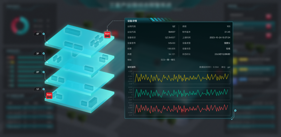 8、全国区域内,有地震发生时,实时计算对项目现场的影响:预估地震烈度,预估到达时间等。并提前通过系统给出预警信息,地震到达前、中、后,数据实时联动记录分析,评估地震实际破坏。