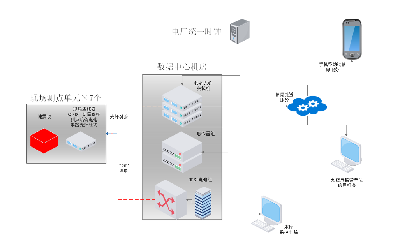 4、测点通过光纤链路连接到本地数据中心机房,或通过4G出传输数据到云端服务器。